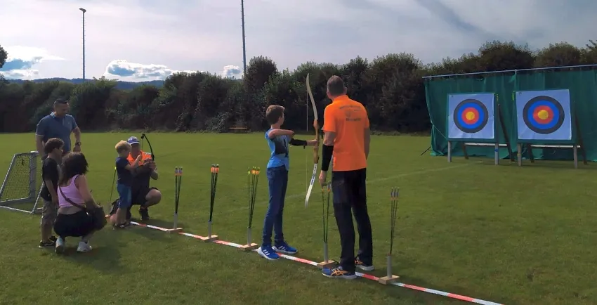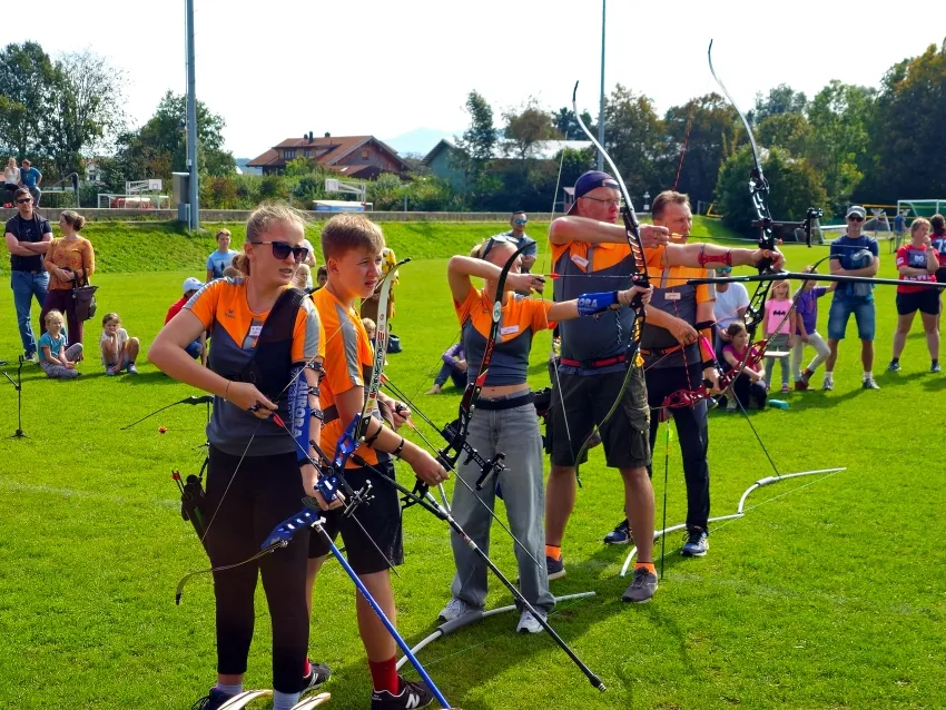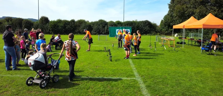 Untermalt mit cooler Musik konnten Kinder und Erwachsenen bei uns ihre Pfeile auf zwei Zielscheiben abschießen. Den ganzen Tag standen unsere Mitglieder für Auskünfte, Fragen und die Ausgabe der Schutzausrüstungen zur Verfügung und brachten den Neulingen unseren Sport näher. Gerade der Kinder-Compoundbogen war bei den „kleinen Robin Hoods“ zwischen sechs und neun Jahren sehr beliebt. Zwischendurch wurden bei einer Vorführung noch die verschiedensten Bogenarten vorgestellt und unseren Schützen, darunter auch viele Jugendschützen, demonstrierten wie es nach ein paar Jahren Training aussehen kann.